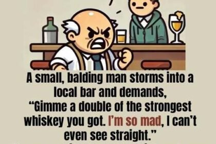 “Gimme a double of the strongest whiskey you got. I’m so mad, I can’t even see straight.” The bartender, noticing…