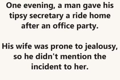 One evening, a man gave his tipsy secretary a ride home after an office party. His wife was prone to…