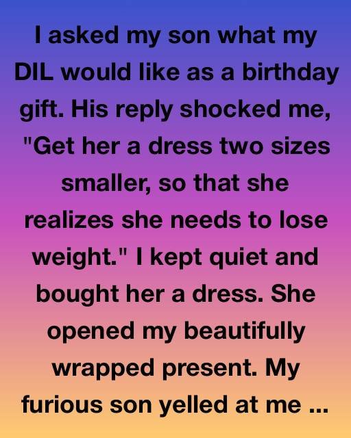 I asked my son what my daughter-in-law would like as a birthday gift. His reply shocked me, “Get her a dress two sizes smaller, so that she realizes she needs to lose weight.” I kept quiet and bought her a dress. She opened my beautifully wrapped present. My furious son yelled at me.