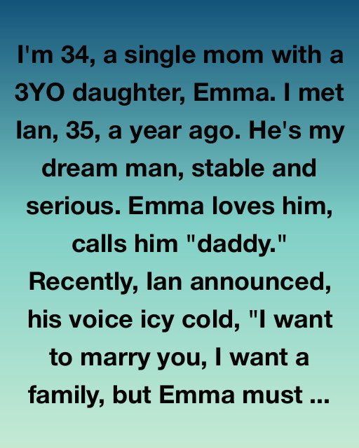 I’m 34, a single mom with a 3-year-old daughter, Emma. I met Ian, 35, a year ago. He’s my dream man, stable and serious. Emma loves him, calls him “daddy.” Recently, Ian announced, his voice icy cold, “I want to marry you, I want a family, but Emma must go live with her father.”