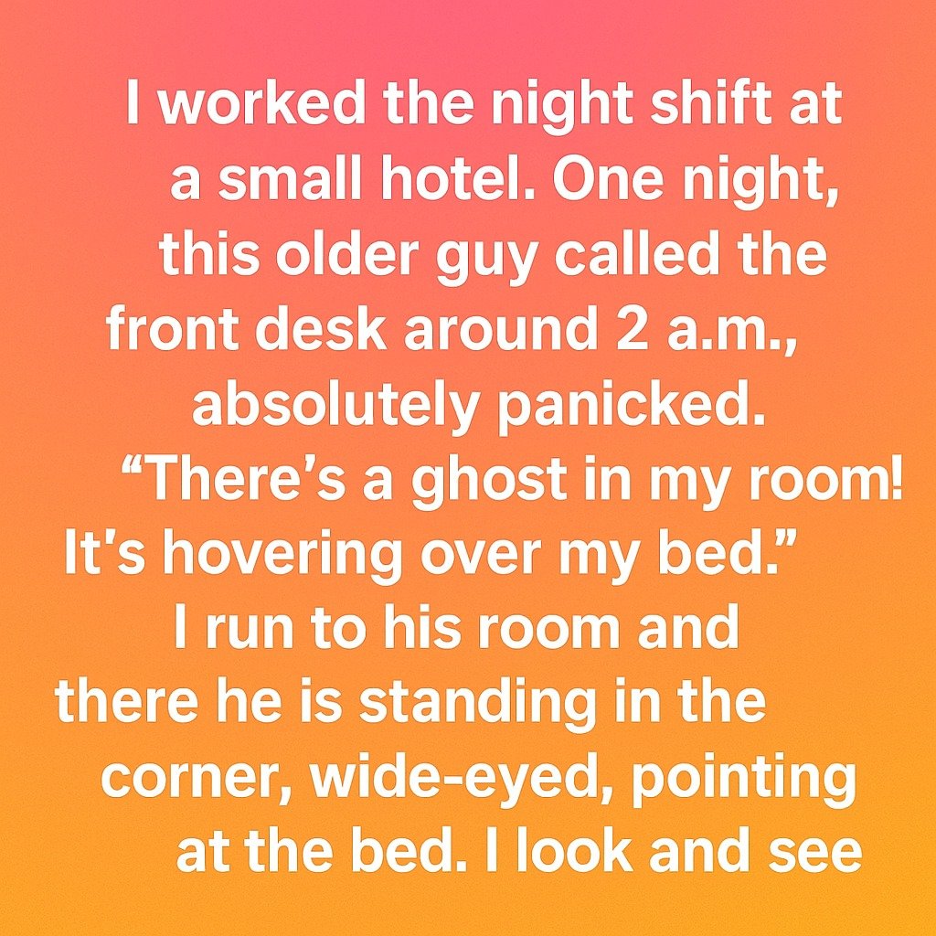 I worked the night shift at a small hotel. One night, this older guy called the front desk around 2 a.m., absolutely panicked. “There’s a ghost in my room! It’s hovering over my bed.”