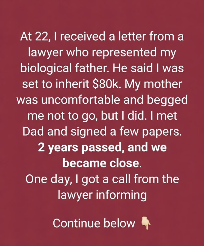 At 22, I received a letter from a lawyer who represented my biological father. He said I was set to inherit $80,000. My mother was uncomfortable and begged me not to go, but I did.