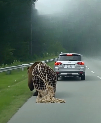 From a distance, the scene was heartbreaking. The net—likely discarded by humans after some roadside or agricultural use—had ensnared the bear’s limbs.