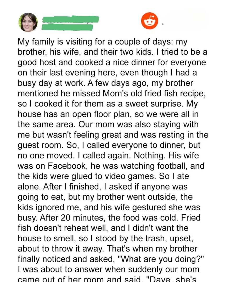My family was visiting for a couple of days — my brother, his wife, and their two kids. I wanted to make their last evening special, so despite being exhausted after a long day at work, I prepared a homemade dinner for everyone. Earlier in the week, my brother had mentioned how much he missed our mom’s old fried fish recipe, so I decided to surprise him by making it, hoping to bring back some warm childhood memories.
