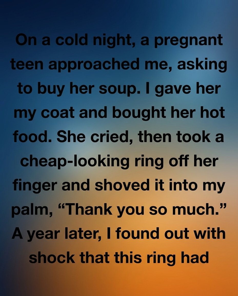 Inside the warm takeaway, she slowly relaxed and introduced herself as Isla. Between bites of food, she shared pieces of her story—leaving home, losing support, and struggling to find a safe place to stay. When she finished eating, she surprised me by offering a small, unimpressive-looking ring as thanks. I tried to refuse, but she insisted, pressing it into my hand and telling me to keep it as a reminder that I had been kind. We parted ways quietly, and I assumed that was the end of our brief crossing of paths. Still, I kept the ring, turning it over now and then, a symbol of how small gestures can matter even when they don’t fix everything.