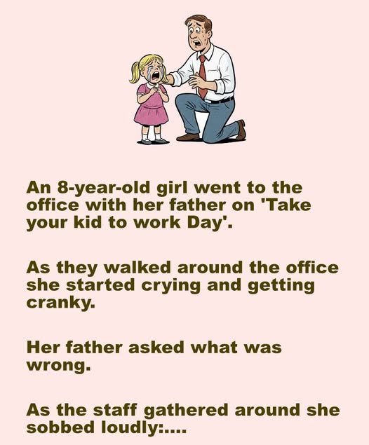 An 8-year-old girl went to the office with her father on ‘Take your kid to work Day’. As they walked around the office she started crying and getting cranky. Her father asked what was wrong.