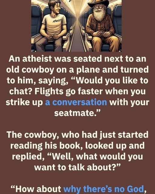 An atheist was seated next to an old cowboy on a plane and turned to him, saying, “Would you like to chat? Flights go faster when you strike up a conversation with your seatmate.”