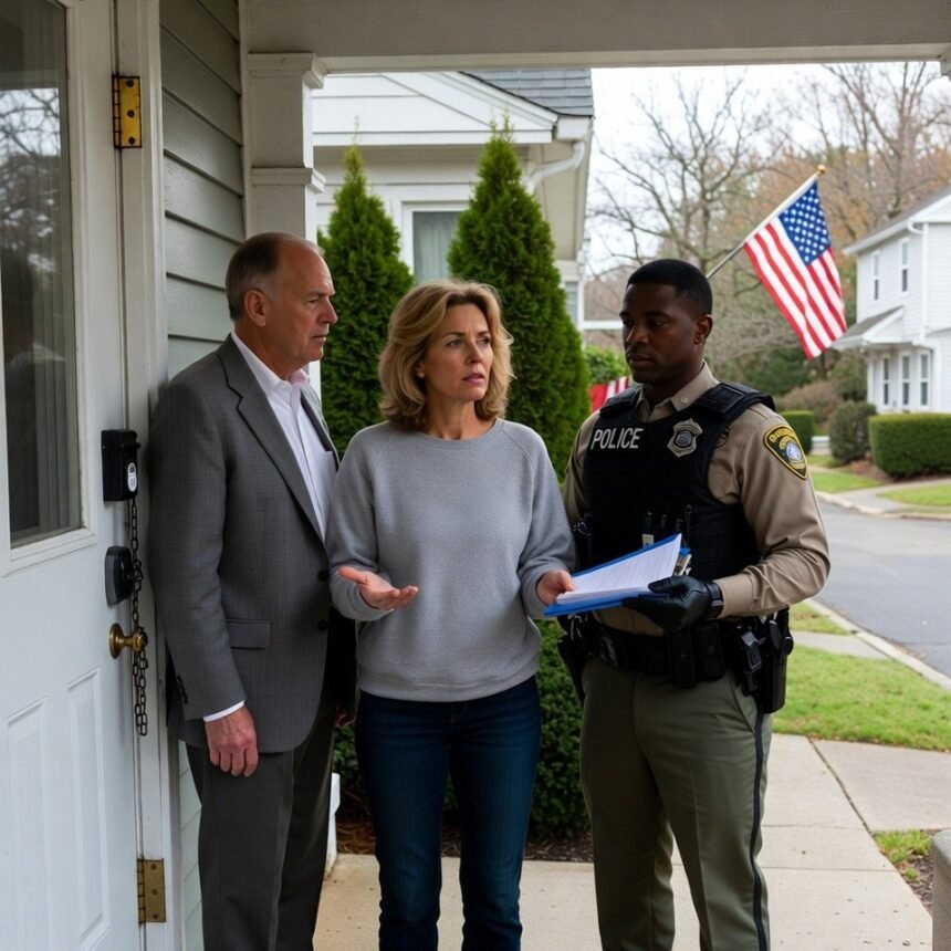 I flipped the porch light on and looked through the peepphole. A deputy sheriff stood on my front step in a tan uniform with a black vest, one hand holding a clipboard of papers. Behind him, his patrol car sat at the curb with its lights off like he decided not to wake the whole street.