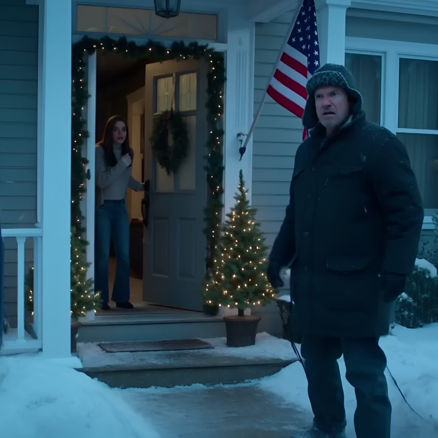 Outside, snow tapped the windows in soft, steady rhythms. The whole suburb looked like something off a holiday card. Every house on our street had lights strung across the gutters, blow‑up Santas sagging on frozen lawns, wreaths glowing warm on their front doors.