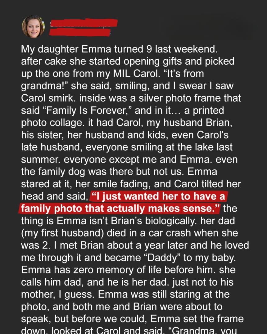 I once overheard her call me “damaged goods” and Emma “extra baggage.” Brian defended us, but her disapproval never faded. At Emma’s ninth birthday, Carol gave her a silver frame engraved “Family Is Forever.” Inside was a collage from our last trip—everyone included except Emma and me. Emma’s smile vanished as Carol smugly added, “I wanted her to have a family photo that makes sense.”