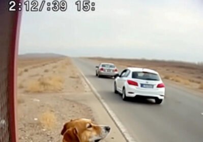 On a deserted highway, a dog was tied to a fence, and around its neck