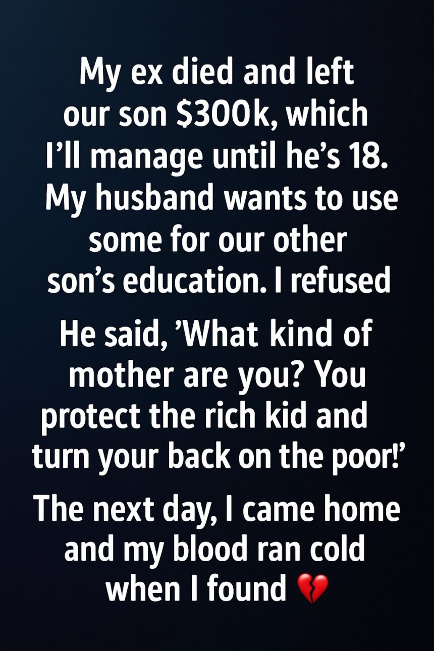The money was left specifically for Liam. It wasn’t mine to share, and I wanted to honor my late ex’s final wish. David was upset and said, “What kind of mother are you?