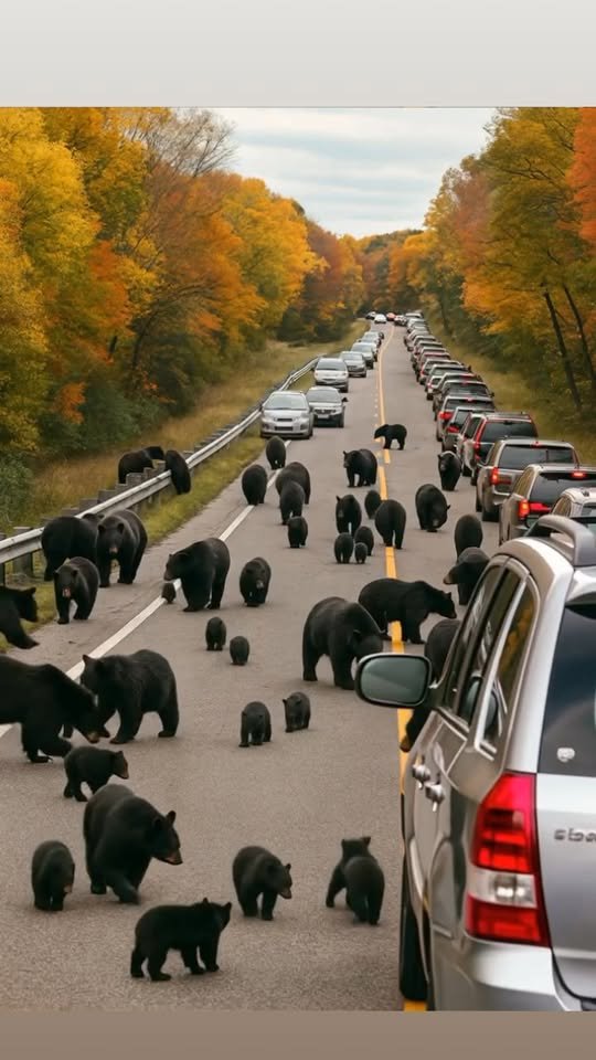 I nodded, but seconds later, I froze at what I saw. Out of the forest, dozens of bears were walking straight onto the road. Huge adults and little cubs moved slowly and confusedly, as if searching for something.