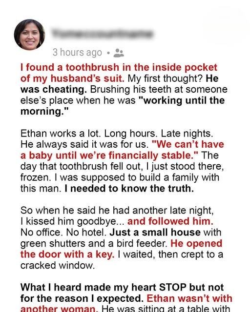 While doing laundry, I found a toothbrush in my husband Ethan’s suit pocket, still smeared with toothpaste. My gut screamed cheating.When he left for a “business trip,” I followed him. But instead of an office, he pulled into a quiet cul-de-sac and walked into a house—with a key.