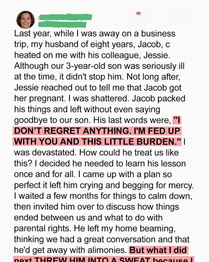 While on a business trip to support our sick son’s medical bills, I never imagined my world would shatter. My husband Jacob cheated with his colleague Jessie — and she proudly announced her pregnancy when I ran into her at the store. Jacob didn’t deny it; he packed up and left, calling our little boy a “burden” before slamming the door.