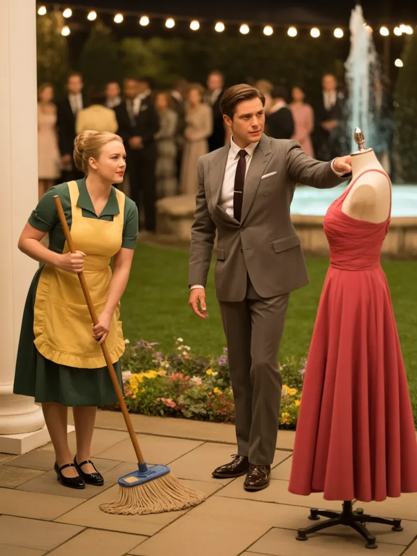 The grand ballroom of a luxury hotel glittered as guests gathered to celebrate the launch of a new fashion collection by hotel owner Alejandro Domínguez. Before the event began, Clara, a quiet employee responsible for cleaning the hall, worked unnoticed among the decorations. During the preparations, an accidental spill drew attention, and Alejandro, trying to amuse the crowd, made a joking remark that if she could ever fit into one of the elegant dresses on display, he would marry her.