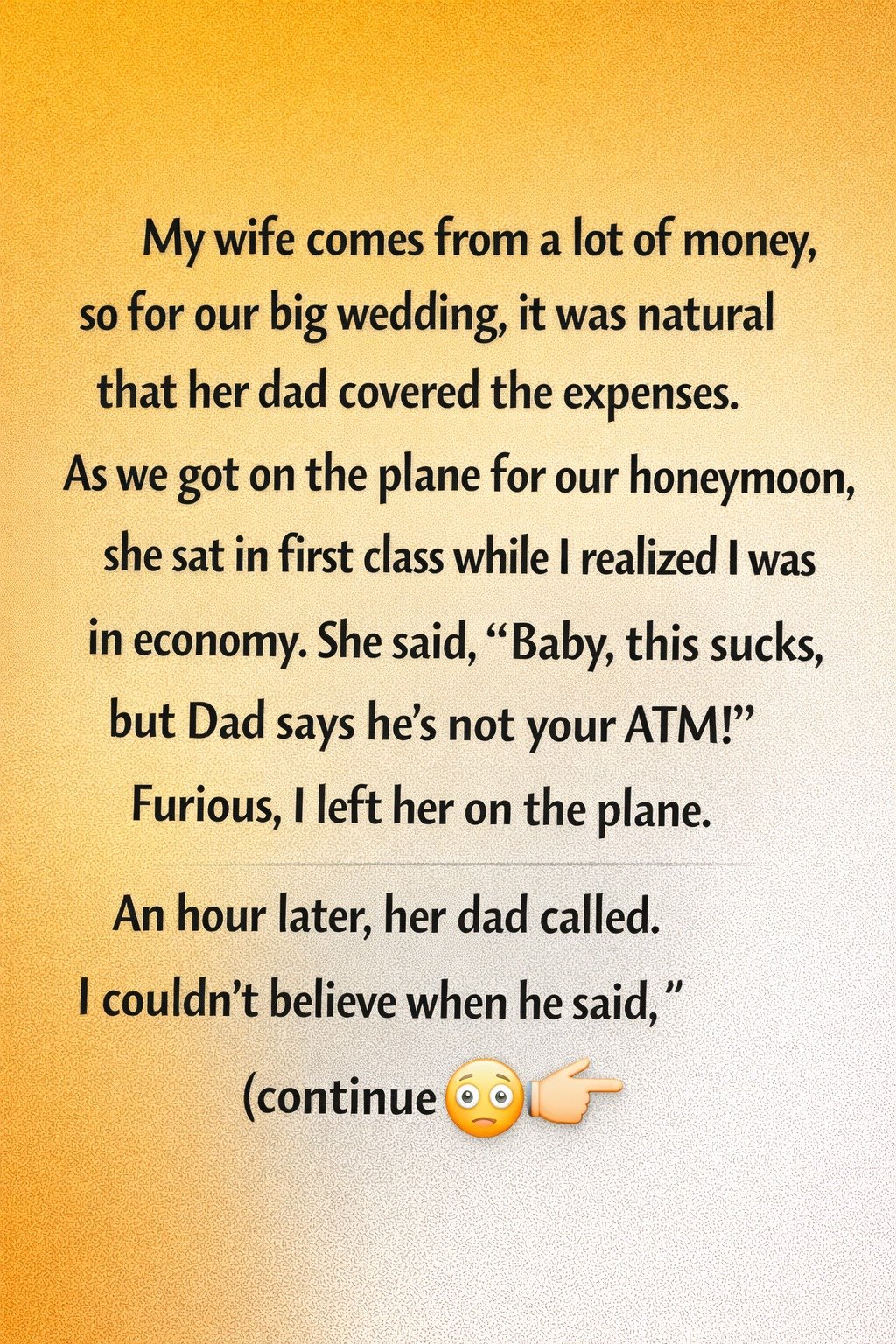 My wife comes from a lot of money, so for our big wedding, it was natural that her dad covered the expenses. I grew up believing that love mattered more than labels, and at first, the difference in our backgrounds didn’t seem important. I was grateful, respectful, and determined to prove that I could build a meaningful life with her through effort and commitment. When we boarded the plane for our honeymoon, however, reality landed harder than expected. She smiled awkwardly as she headed toward first class while I stood frozen in the economy aisle. Her words were meant to sound lighthearted, but they stung deeply, reminding me—at the worst possible moment—that I was seen as someone who didn’t quite measure up.
