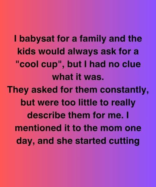 Eventually, she got them back. She asked if I’d still babysit sometimes, and I said yes. The first time I came back after they were home again, the kids ran to the kitchen and shouted, “Cool cups!” Their mom laughed and joined us, cutting apples like nothing had ever changed—except now, I knew how fragile and precious that “normal” really was.