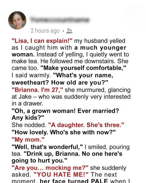 Lisa returned home early from a trip and sensed something was wrong when the house felt unnaturally quiet. Following a noise upstairs, she discovered her husband, Jake, with a younger woman named Brianna. Instead of reacting with anger, Lisa calmly invited them both to the kitchen for tea.