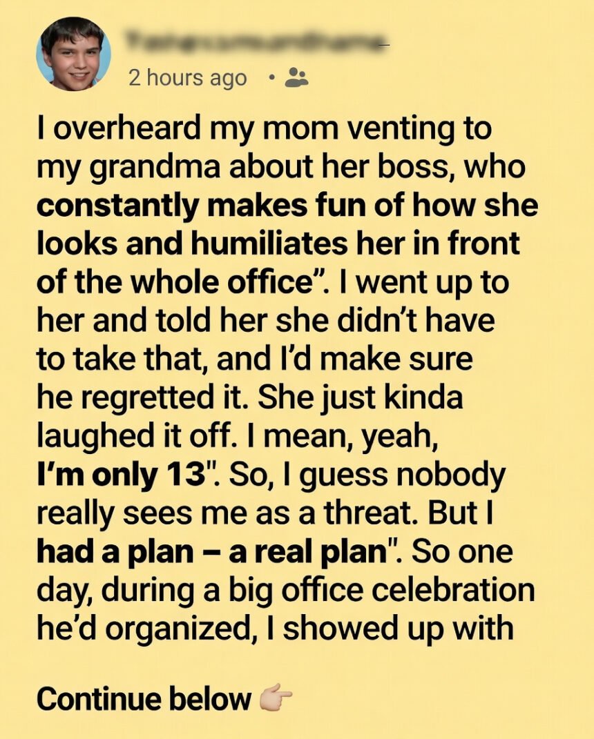 One night, I overheard Mom crying on the phone to Grandma. Her boss, Richard, had mocked her thrift store clothes in front of her coworkers, belittling her and making her feel worthless. My heart broke, and anger bubbled inside me.
