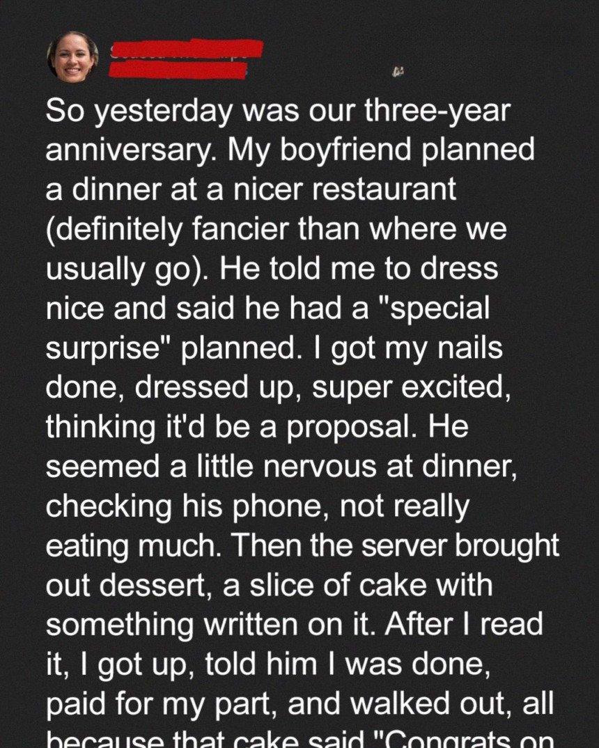 I spent three years loving Ryan, certain he’d propose on our anniversary. He made a fancy restaurant reservation, told me to dress up, and hinted at a “special surprise.” I arrived in an emerald dress, my heart racing — only for dessert to arrive with pink icing reading: “Congrats on Your Promotion!”