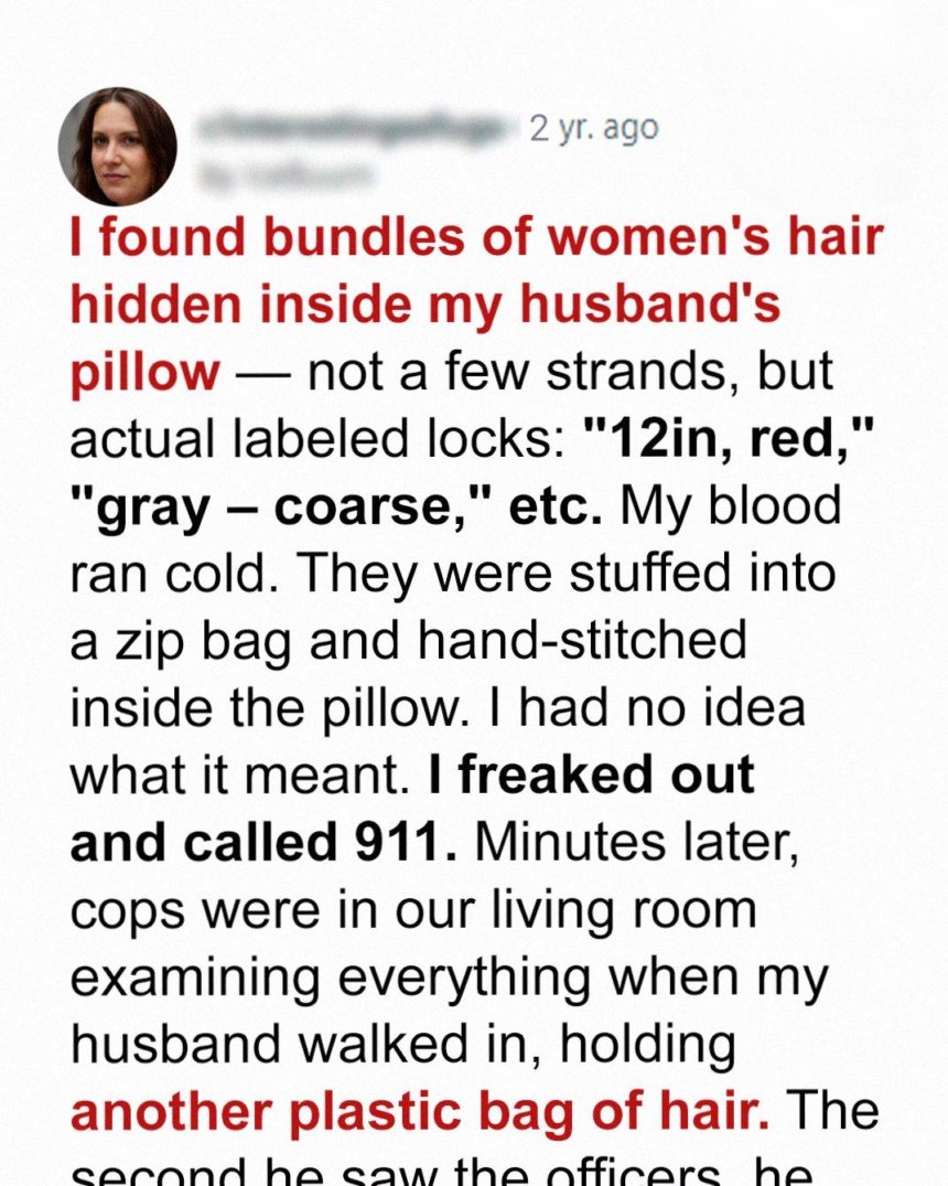 One evening, curiosity—and heartbreak—got the best of me. I ripped open the pillow and found bags of hair inside—real, labeled, human hair. Blonde, red, gray—each carefully stored with notes.