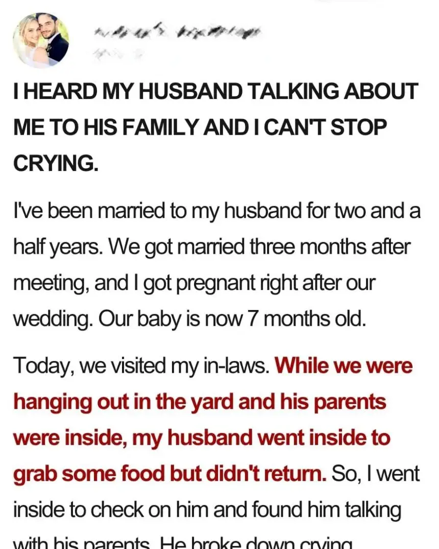 Her husband, unbeknownst to him being overheard, expressed his overwhelming happiness and gratitude for his wife and daughter in a vulnerable conversation with their parents.