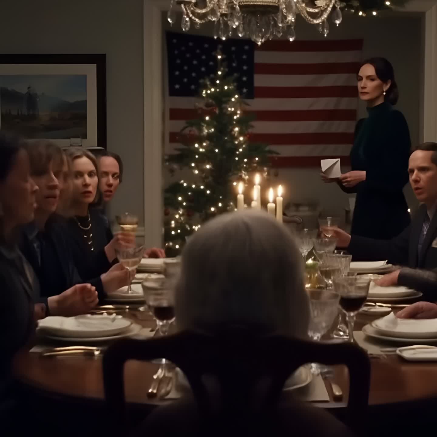Everyone filed into the dining room, their conversation stopping mid-sentence as they took in the elaborate setup.