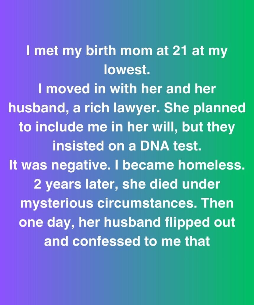 I met my birth mom at 21 at my lowest. I moved in with her and her husband, a rich lawyer. She planned to include me in her will, but they insisted on a DNA test.