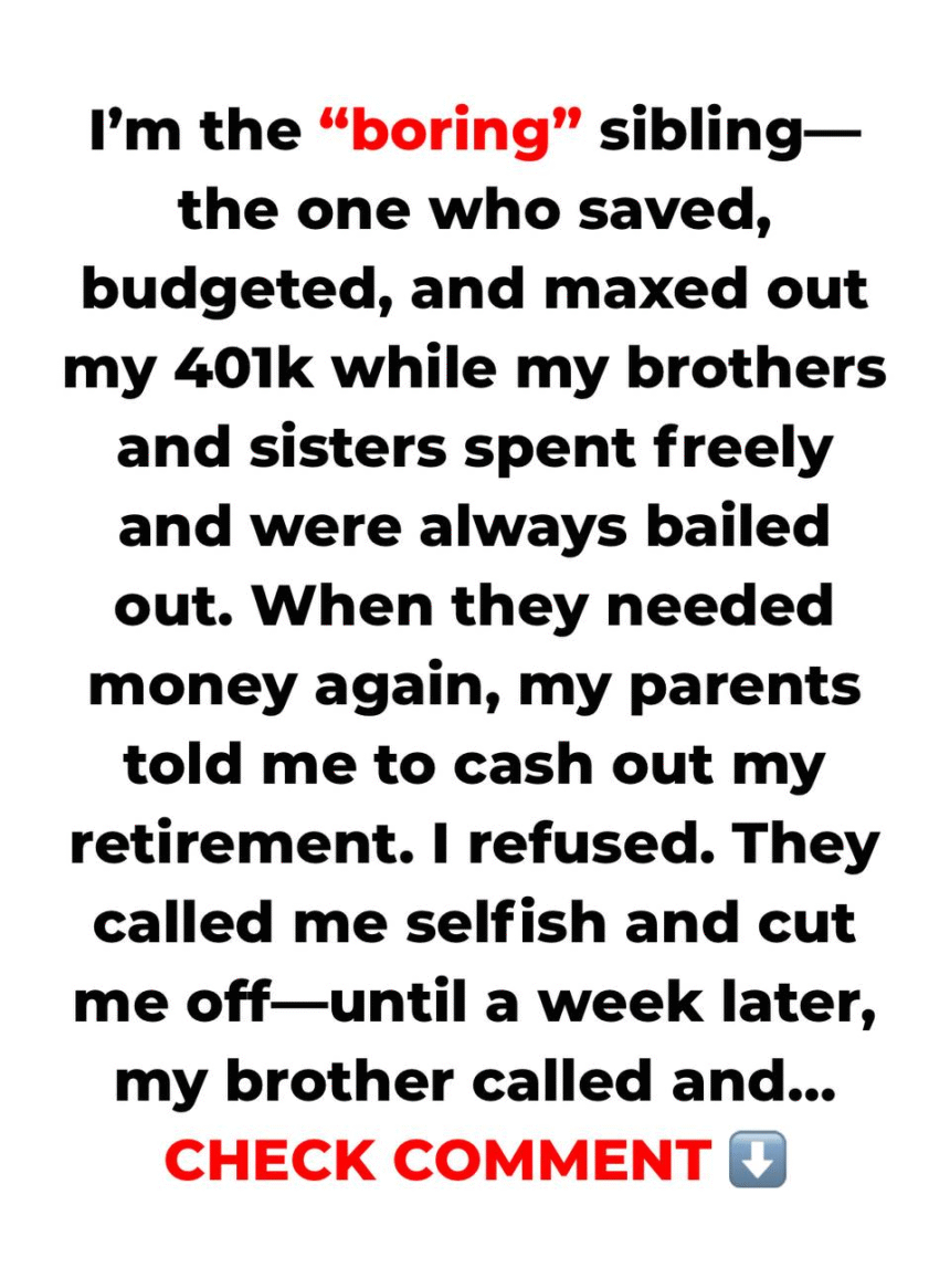 While my brother and sister hopped between jobs and spent every cent on festivals and gadgets, I worked overtime, lived on a strict budget, and maxed out my 401k. My parents always enabled them, saying I was the “responsible one” who didn’t need help.