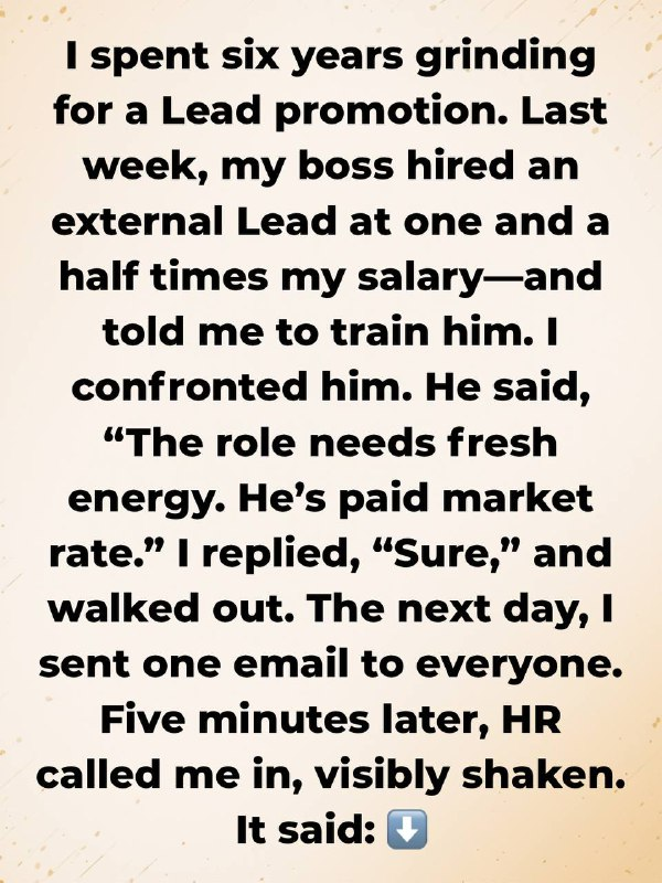 I spent 6 years grinding for the Lead promotion. Last week, my boss hired an external Lead at 1.5x my pay and told me to train him. When I confronted him, he said, “The role needed fresh energy, and he’s paid market rate.” I said “Sure” and walked out. The next day, I sent one email to everyone.