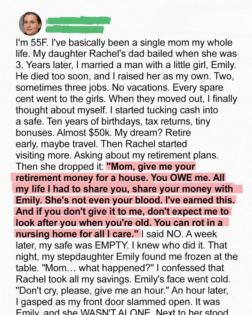 After a lifetime of sacrifice, I finally saved enough for a modest retirement—my small piece of peace after years of raising two daughters, Rachel and Emily. I thought I had done enough. I gave them everything I could, even when it meant going without myself.