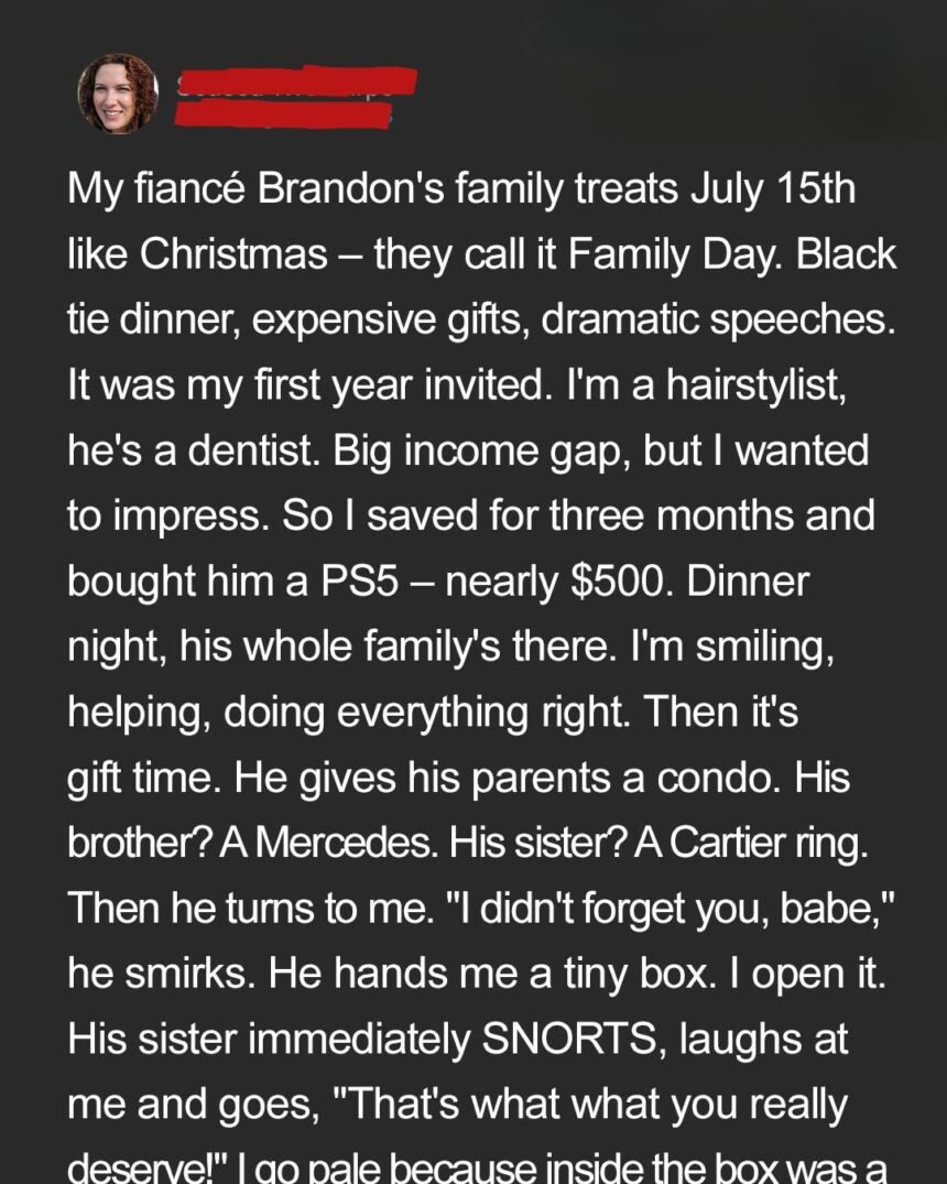 When my fiancé Brandon invited me to his family’s annual “Family Day,” I was thrilled. Coming from a modest background, I wanted to fit in with his wealthy, tight-knit family. Brandon often mentioned wanting a PS5, so I spent three months saving every extra dollar to buy it for him.