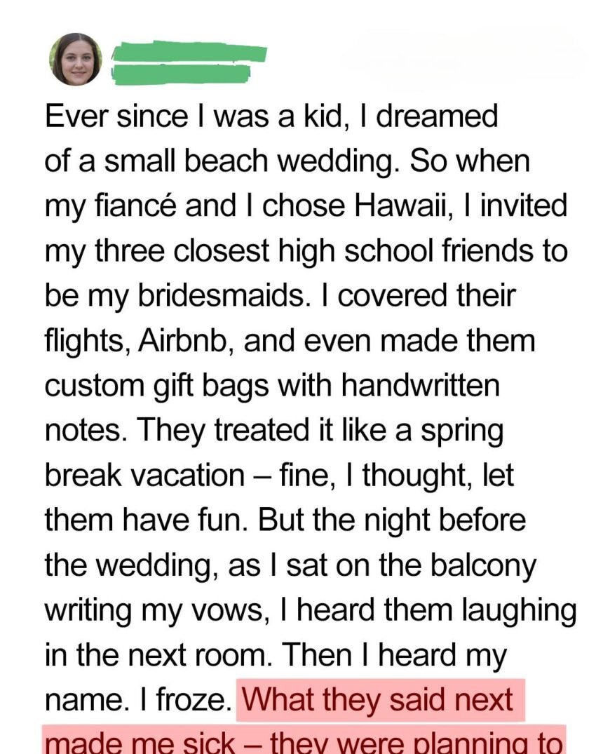 I dreamed of a small, perfect beach wedding. I invited my three closest friends—Jess, Marcy, and Aly—as bridesmaids. I paid for their flights, the Airbnb, even made gift bags.