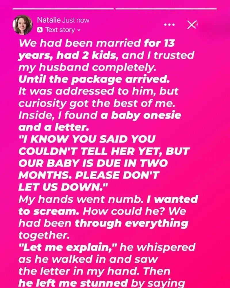 Inside, I found a baby onesie and a letter. It read, I know you said you couldn’t tell her yet, but our baby is due in two months. Please don’t let us down.