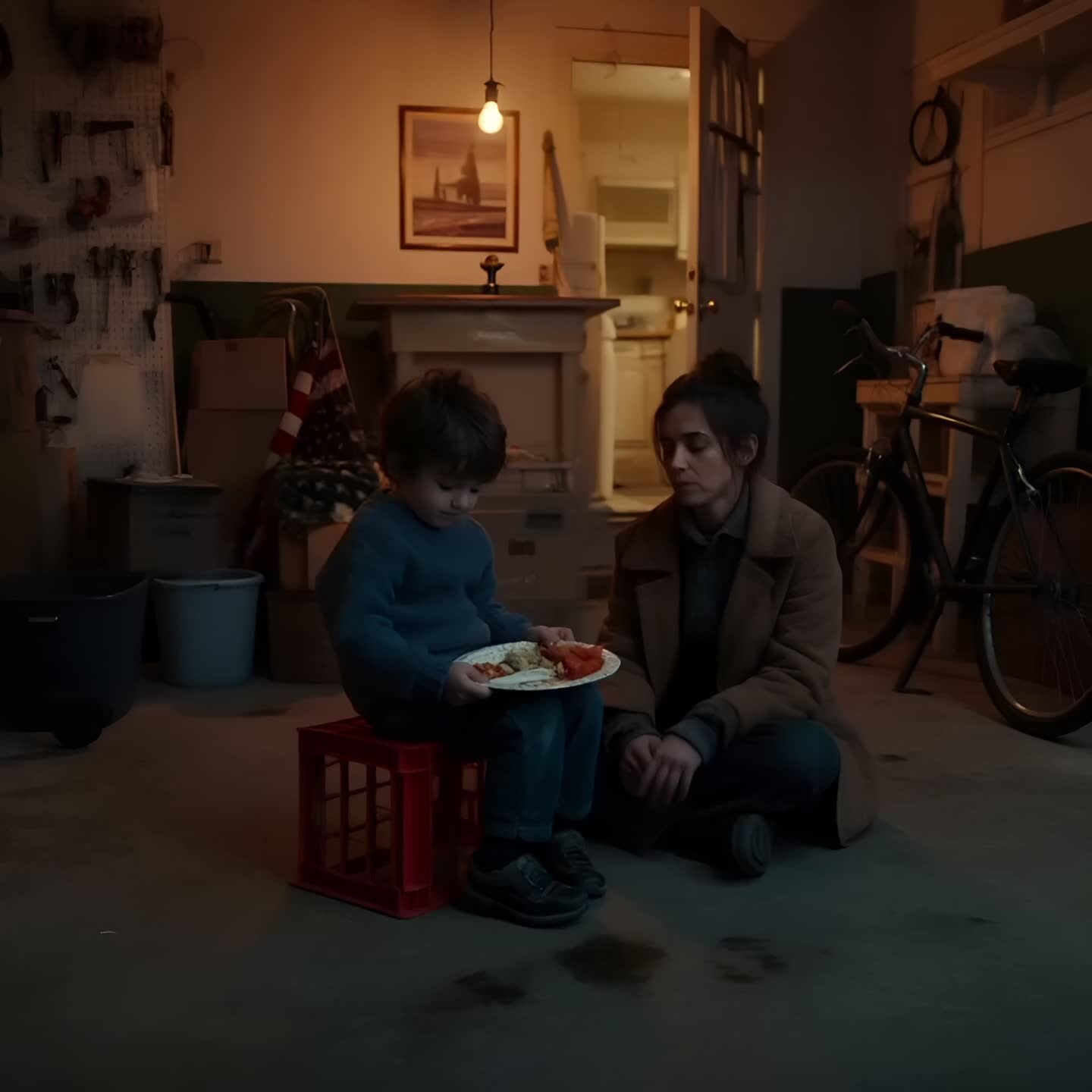 I stood frozen in the doorway between the dining room and the garage, watching my six-year-old son, Jacob, sit on an overturned crate near the trash can. He had a paper plate balanced on his knees, eating the leftovers my sister had scraped together for him. The garage smelled like oil and mildew, and the single bulb hanging from the ceiling barely lit the space. Jacob’s little legs dangled, his sneakers scuffed and worn, and he ate quietly like he was trying not to be noticed.
