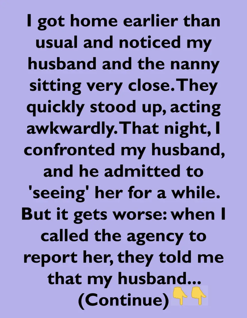 Then last week, I got home earlier than usual and noticed my husband and the nanny sitting very close. They quickly stood up, acting awkwardly.