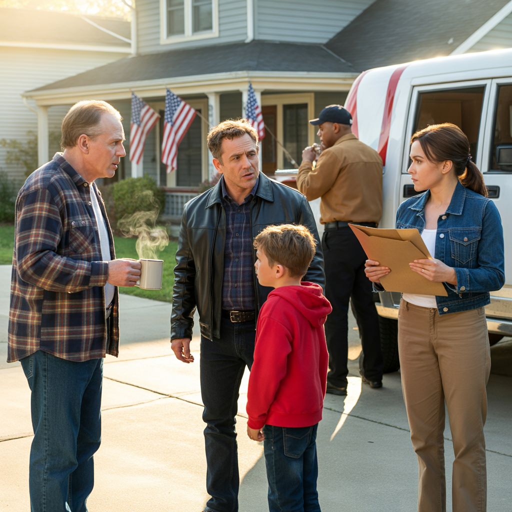 Through the frosted glass of the front door, I could see shapes—more than one—standing on my porch. The motion light had clicked on, casting them in harsh white illumination. When I opened the door, my son Daniel stood before me. Beside him was Claire, his wife of eight years, holding a leather folder against her chest like armor. Behind them, three men in matching navy uniforms waited near a large truck parked in my driveway. The words Premiere Moving Services were painted on the side in gold letters. The engine was still running, exhaust rising into the cold morning air like breath from a sleeping beast.