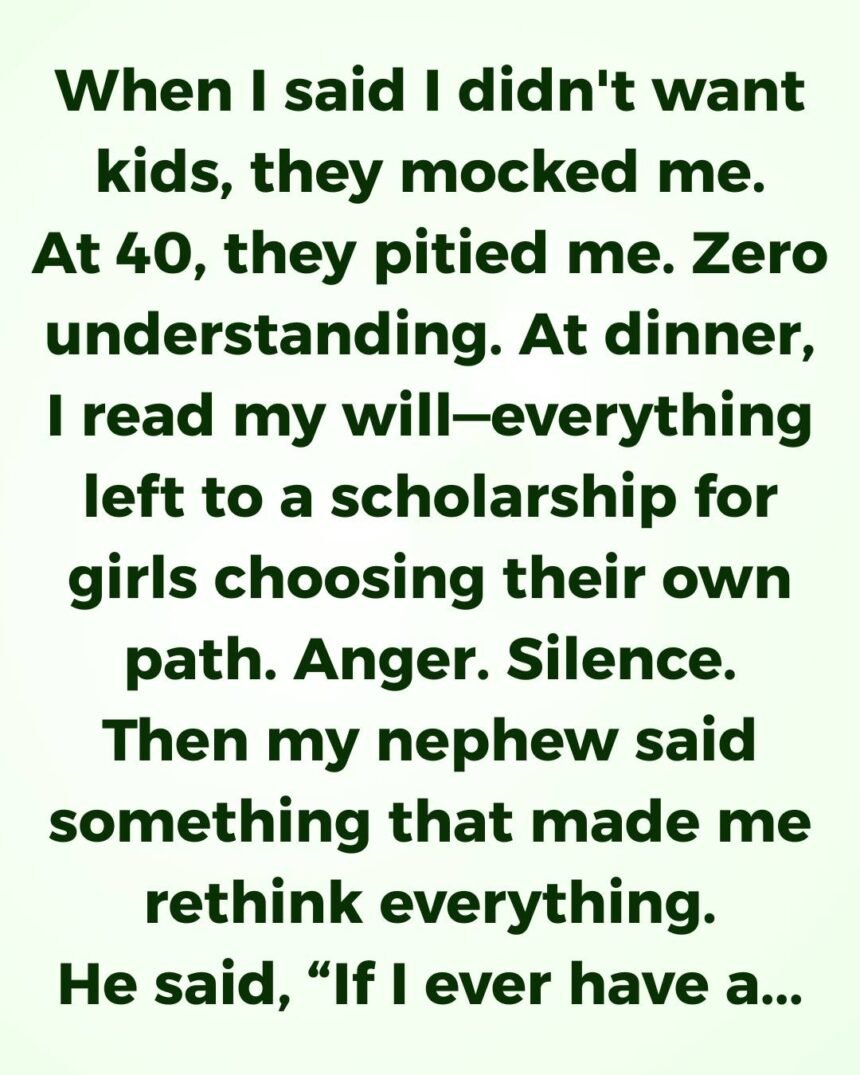 When I made the announcement, the laughter stopped all at once. I had left my entire estate — my savings, my house, everything — not to my nieces and nephews, but to a foundation I’d recently started: a scholarship fund for young women who choose a different path.