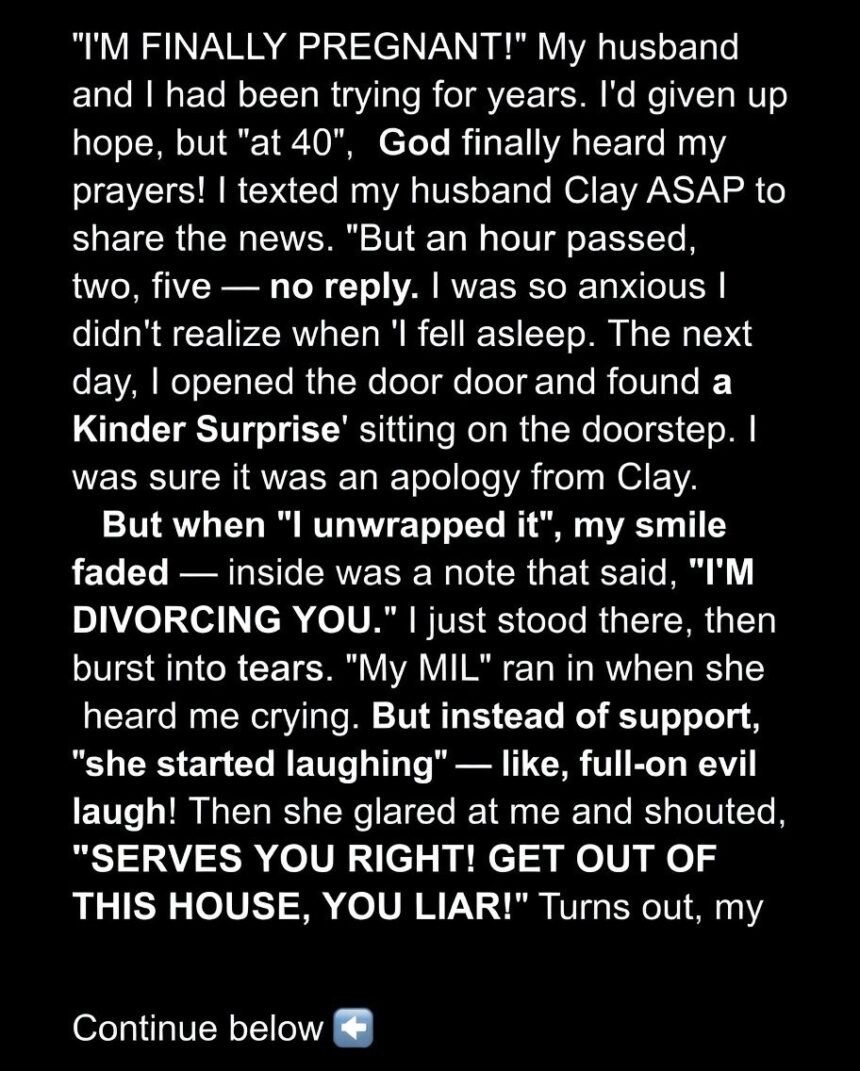 The next morning, she found a Kinder Surprise at the door. Expecting a sweet gesture, she opened it only to discover a note inside: “I’m divorcing you.” Her happiness crumbled in an instant.