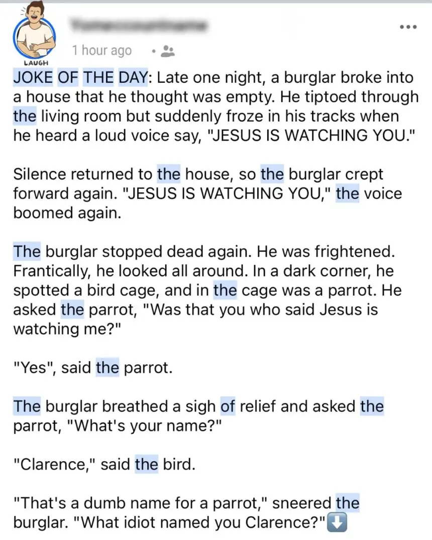 Late one night, a burglar broke into a house. As he tiptoed through the living room, a booming voice stopped him in his tracks: “Jesus is watching you!”