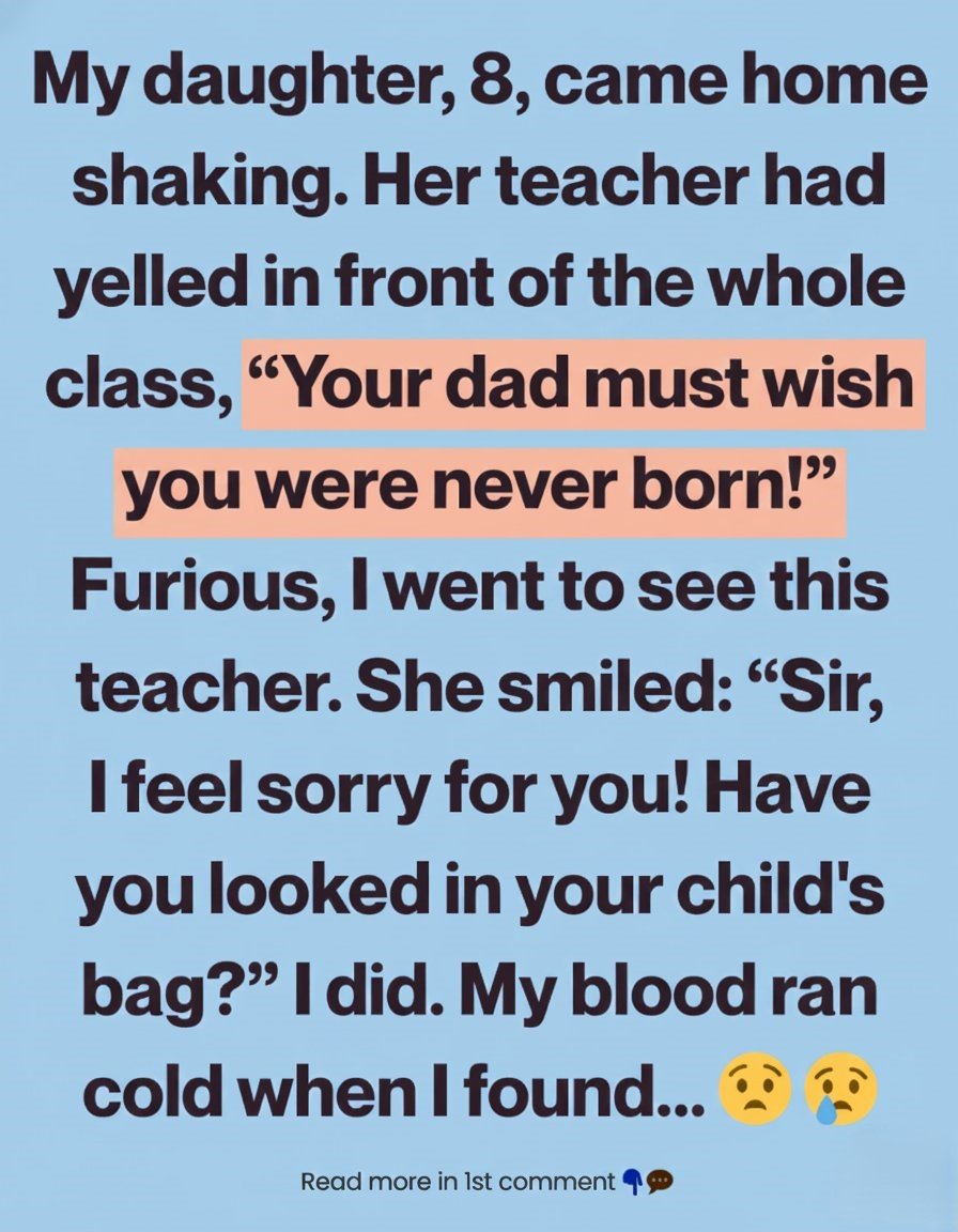 I went to the school furious, ready to demand answers. The teacher listened calmly as I repeated my daughter’s words. Then, to my surprise, she smiled—thin and knowing.