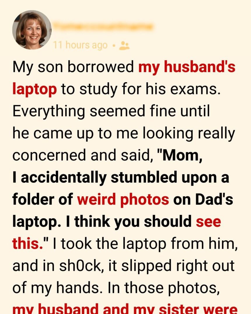 “Mom,” he said quietly, holding the laptop like it weighed a hundred pounds. “I accidentally stumbled upon a folder of… weird photos on Dad’s laptop. I think you should see this.”