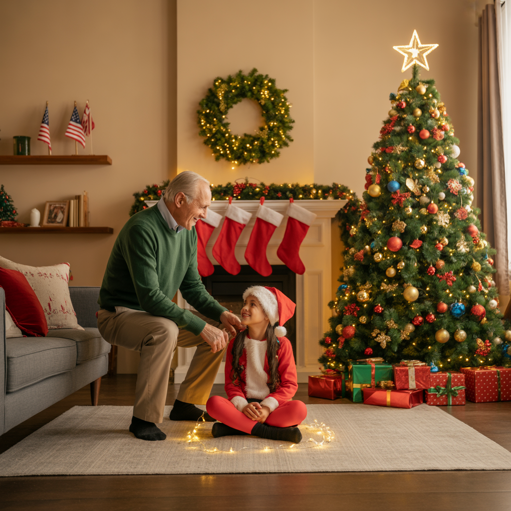I stood near the door holding my daughter Savannah. She’s four, still at that age where she believes Christmas magic doesn’t run out. She was clutching a drawing she’d been working on for days. Stick figures in bright colors, little hearts floating above everyone’s heads, a Christmas tree in the middle with the words Happy Together scribbled across the top. She slipped out of my arms and ran straight to my father.