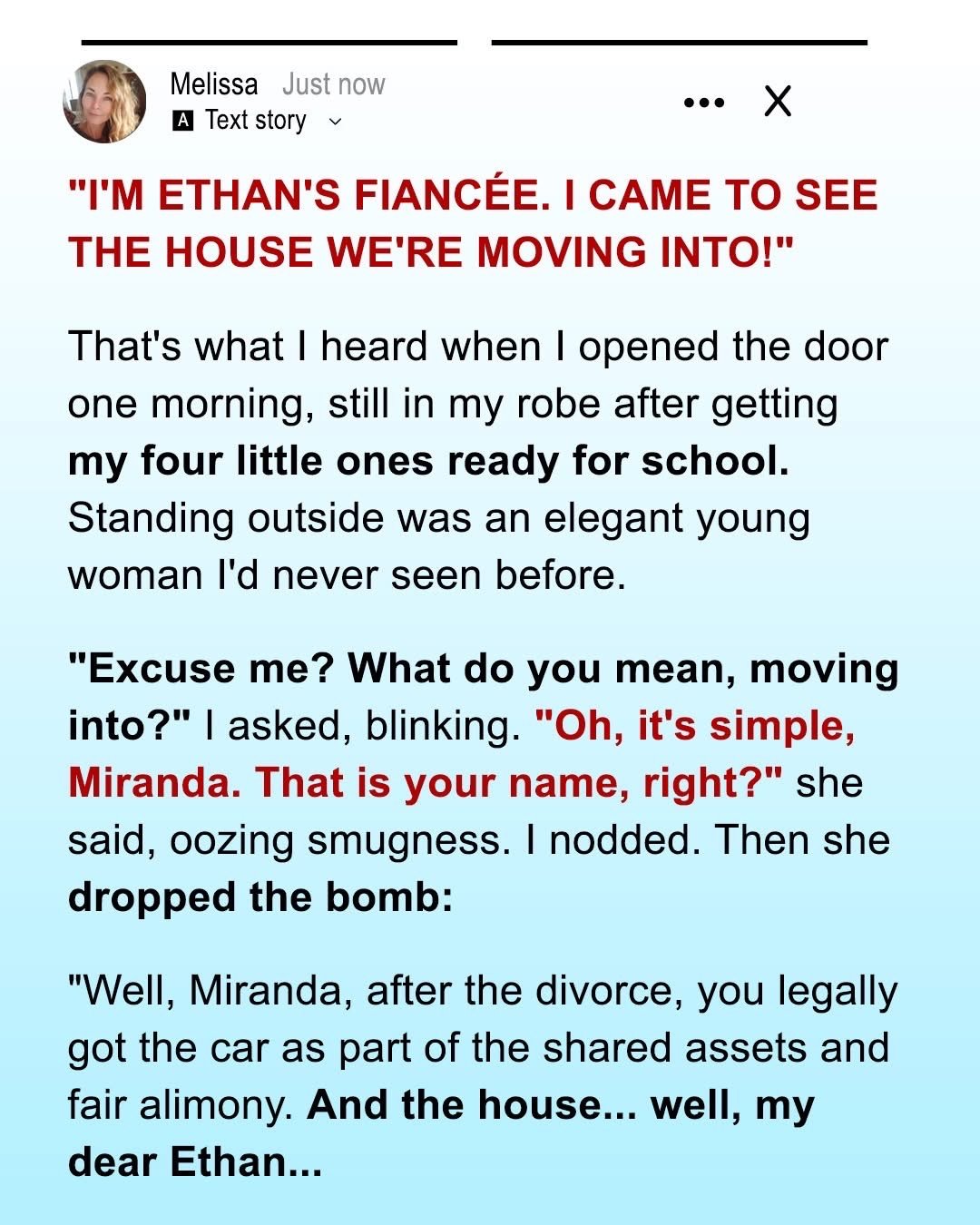 “After the divorce, you got the car and fair alimony. The house? Well, Ethan gave it to me as an engagement gift!”