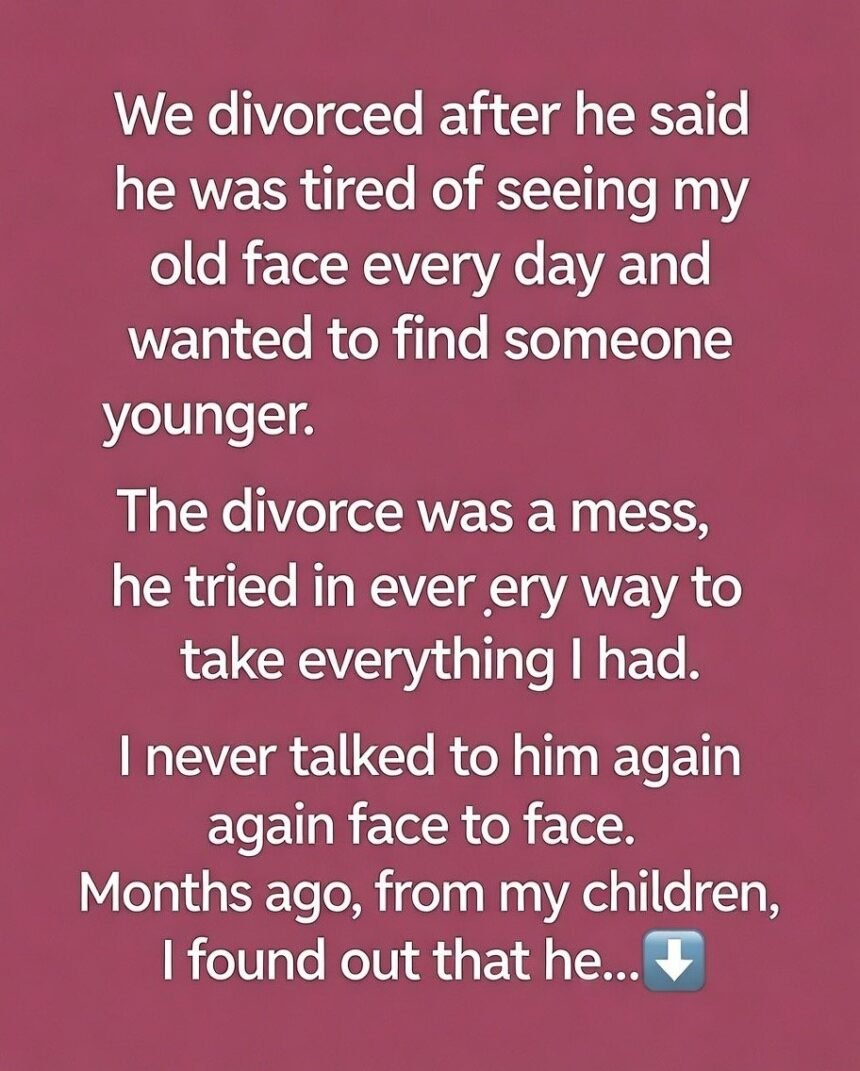 We divorced after he said he was tired of seeing my old face every day and wanted to find someone younger. The divorce was a mess—he fought to take my assets, left me with half of his debts, and made the whole process as painful as possible. When the papers were finally signed, I vowed never to speak to him again.