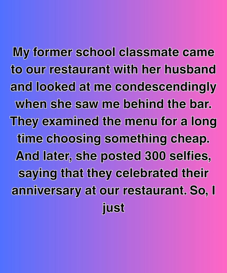 My former school classmate came to our restaurant with her husband and looked at me condescendingly when she saw me behind the bar. They examined the menu for a long time choosing something cheap. And later, she posted 300 selfies, saying that they celebrated their anniversary at our restaurant.