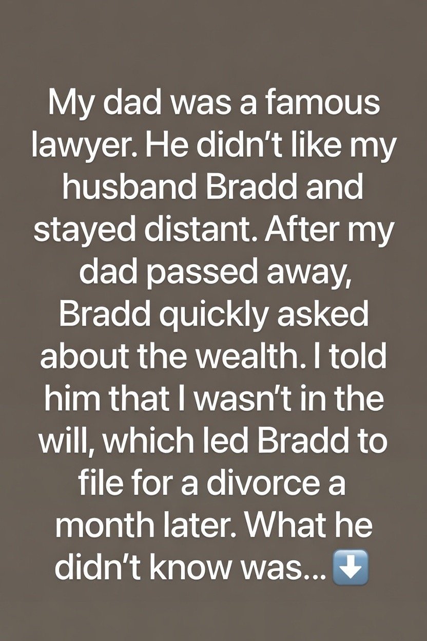 A week later, Sarah’s father’s lawyer called her in. Her father had left a private addendum to his will: If Bradd remained married to Sarah for five years after his death, he would receive half the inheritance.