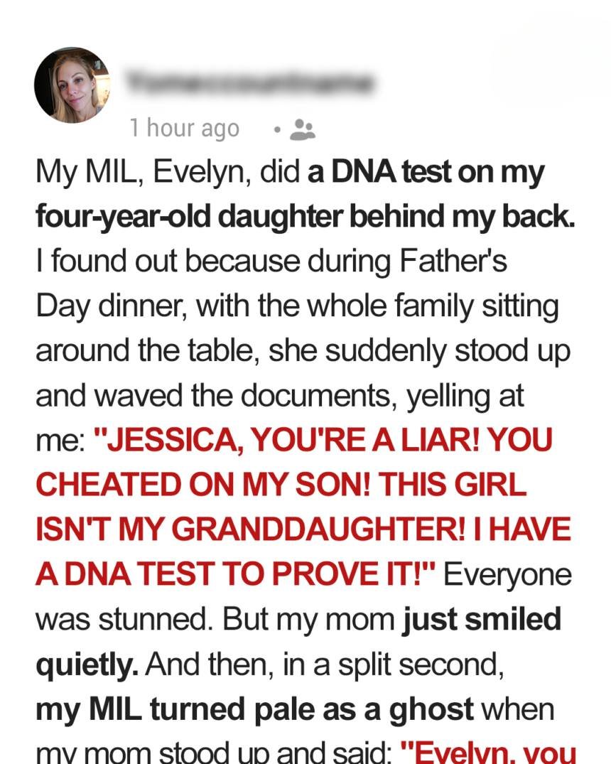 When Jessica agreed to spend Father’s Day with both families, she hoped for peace, not drama. But her mother-in-law, Evelyn—never subtle and always critical—had other plans. In the middle of dessert, Evelyn stood, clutching a manila folder, and accused Jessica of lying about her daughter’s paternity.