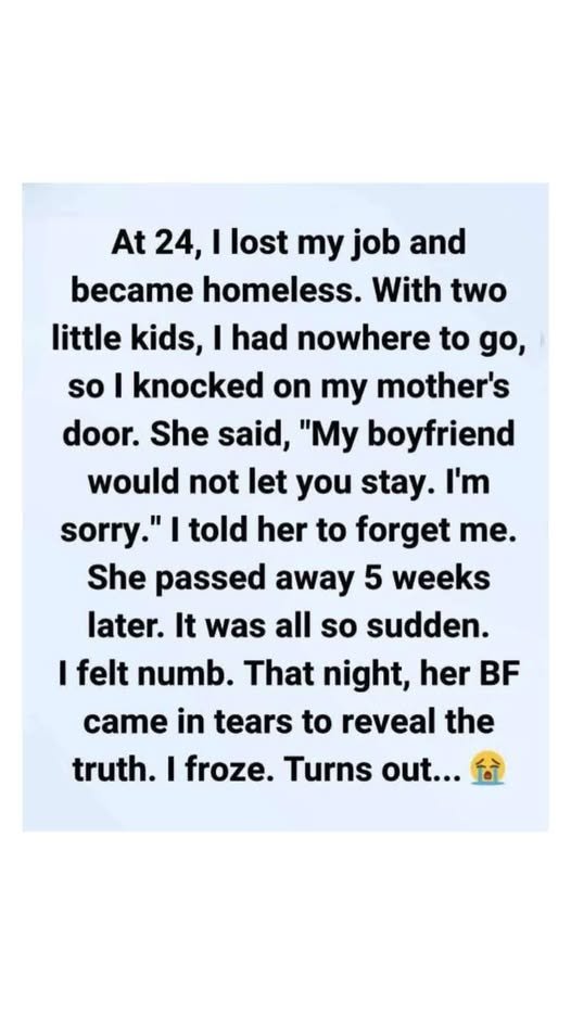 When she opened the door, she looked smaller than I remembered—thinner, shoulders slumped, eyes heavy with fatigue—but still carrying that familiar warmth that had once made everything seem solvable. Words poured out of me before I could stop them. I explained losing my job, the eviction, washing up in gas station bathrooms, and sleeping under streetlights because it felt safer than hidden corners.